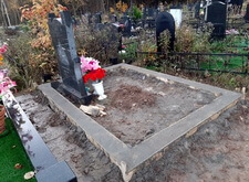 В данном заказе нам предстояло провести полный комплекс работ по благоустройству места захоронения. В момент нашего приезда на участок на могиле находился лишь широкий памятник и разобранная ограда, которую нам и предстояло разместить по периметру могилы.