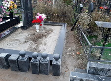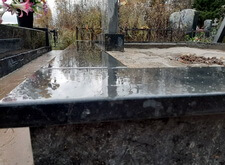 Завершающим этапом стала сборка оградки и укладка брусчатки. Ограждение мы создали из находившихся на могиле секций, кое где закрепив отломавшиеся навершия на разделительные столбики. Перед памятником мы установили гранитный цветник и две траурные урны, а по правую сторону от входа поставили заказанную клиентом лавочку, тоже изготовленную из чёрного гранита. Брусчатку мы замыли водой, одновременно удаляя всю строительную пыль, образовавшуюся в процессе работы.
