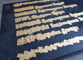 Саму гравировку мы выполнили при помощи пескоструйного аппарата и сразу же принялись за покрытие текста сусальным золотом. Начали с орнамента, так как работать с элементами декора проще, чем с печатным текстом.